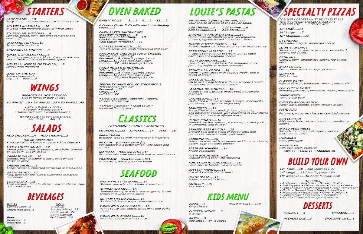 Family-friendly options are also available on their Kids Menu, with highlights like Kids Spaghetti Marinara and Chicken Tenders with Fries, ensuring there's something for everyone at Little Louies.